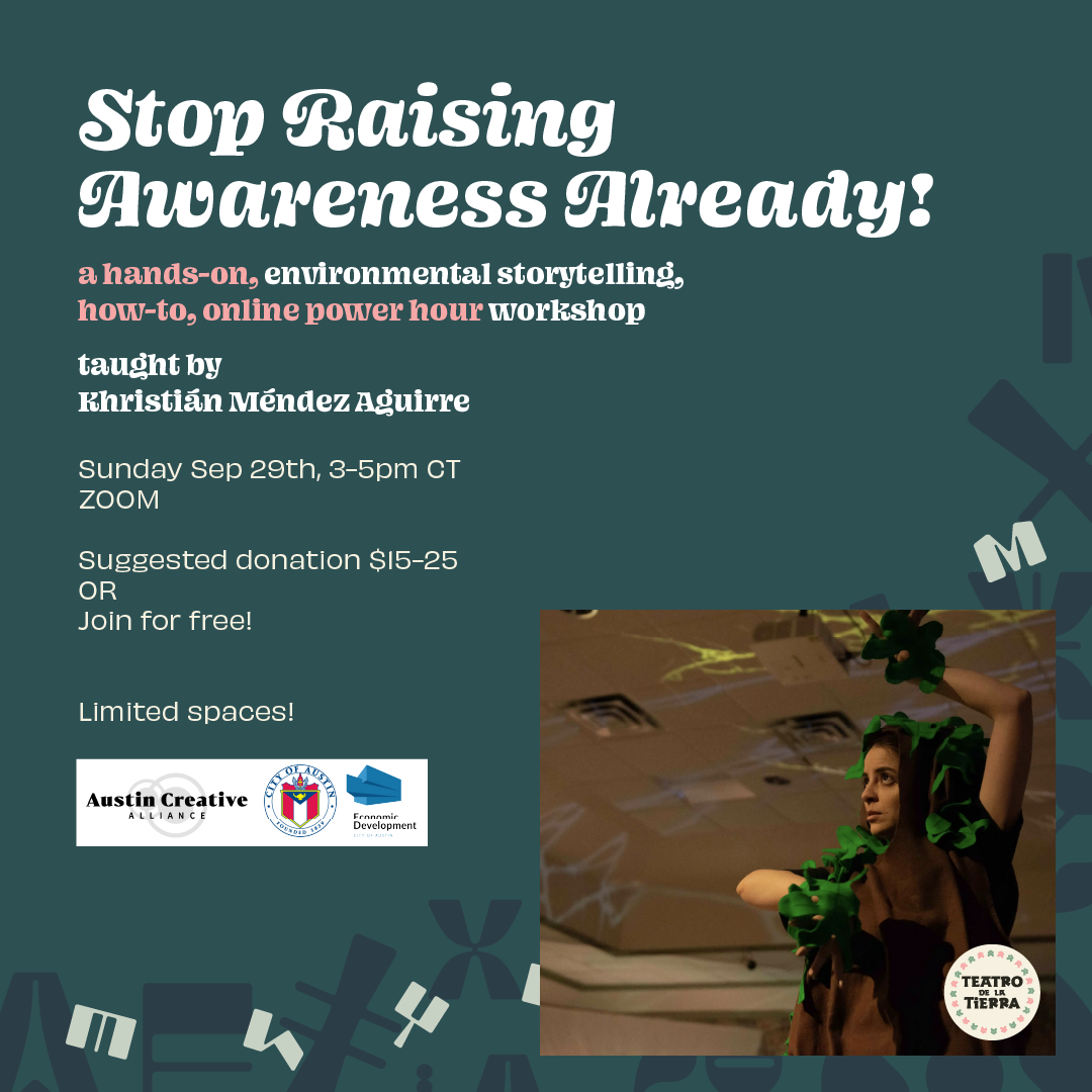 ¿Cómo podríamos historias sobre temas ambientales de manera fresca e innovadora? ¿A dónde vamos a buscar inspiración? ¿Y cómo discutimos el papel que el teatro y el contar historias pueden jugar en construir un mundo con justicia ambiental?